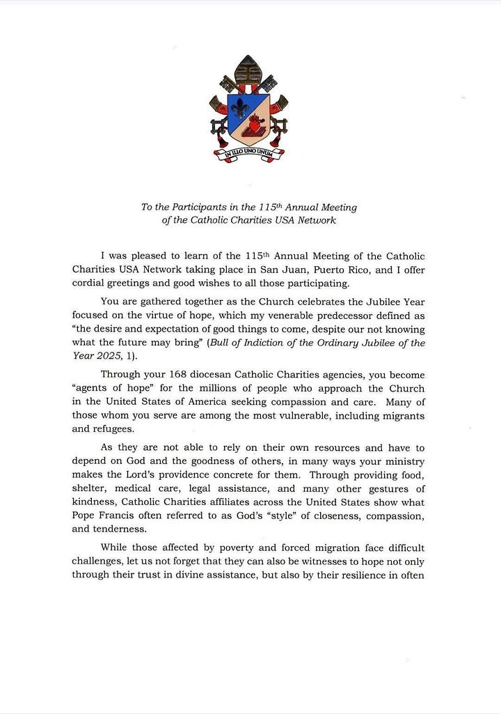The pope commended Catholic Charities’ 168 agencies as “agents of hope” for the vulnerable, saying their outreach “makes the Lord’s providence concrete” for families forced to rely on others.