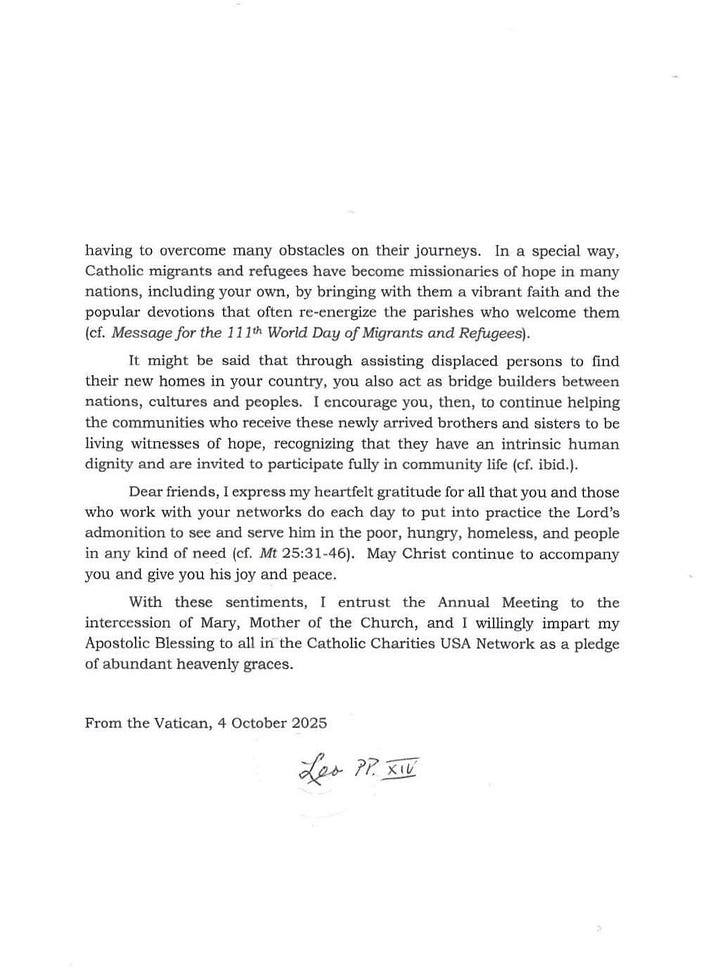 The latest broadside came in a letter Pope Leo sent to Catholic Charities USA’s 115th Annual Meeting this week, where he hailed immigrants as “witnesses to hope” and praised those who welcome them.