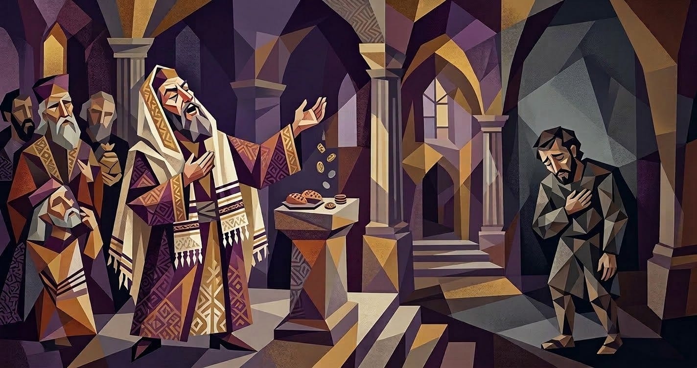 The Pharisee arrives with a script — he has rehearsed his lines about fasting and tithing and moral superiority over the tax collector standing at the back of the room. His prayer is a performance review delivered to an audience of one: himself.