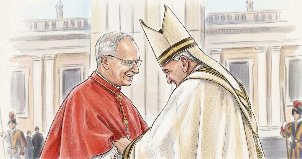 In March I wrote here about Gerard O’Connell and Elisabetta Piqué’s minute-by-minute reconstruction of the conclave, which traced Francis’s last institutional gestures — the dizzying promotion of Prevost from bishop of Chiclayo, to Vatican prefect of the Dicastery for Bishops, to cardinal priest, and then, while Francis laid sick at Gemelli Hospital in February, to cardinal bishop of Albano, the senior tier of the College that elects a pope.