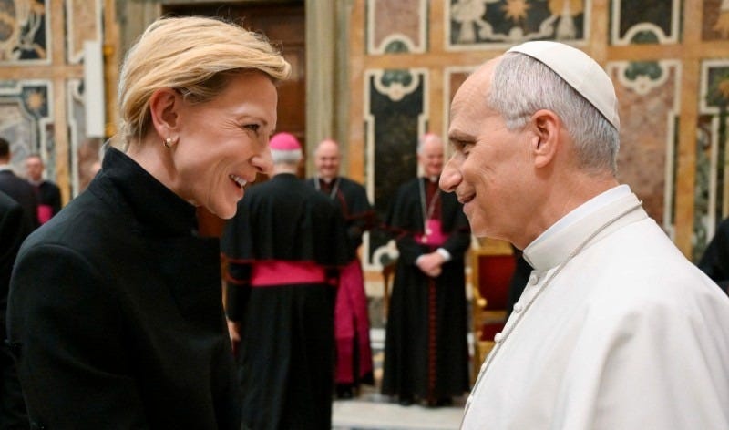Screen icons Cate Blanchett, Monica Bellucci, Chris Pine, and former Conclave papabile star Sergio Castellitto were among the three dozen Hollywood figures who sat down with Pope Leo for a special audience