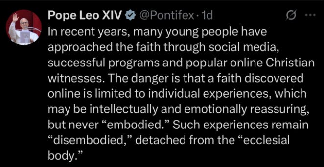 In other words, a Christianity confined to YouTube and Instagram can turn into a hollow, disembodied spirituality detached from the living Church.
