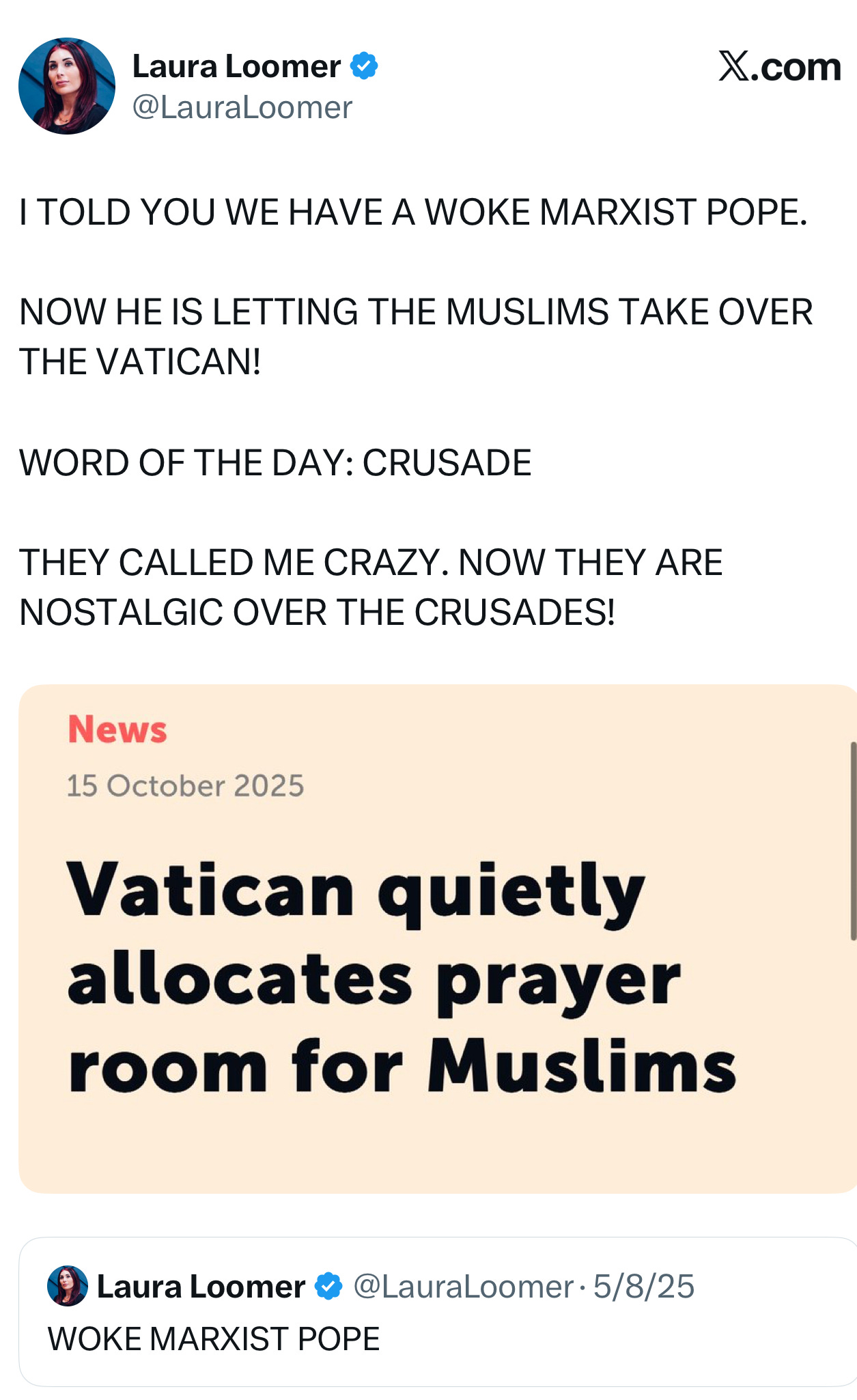 Far-right agitator Laura Loomer thundered that “we have a WOKE MARXIST POPE… letting the Muslims take over the Vatican!”