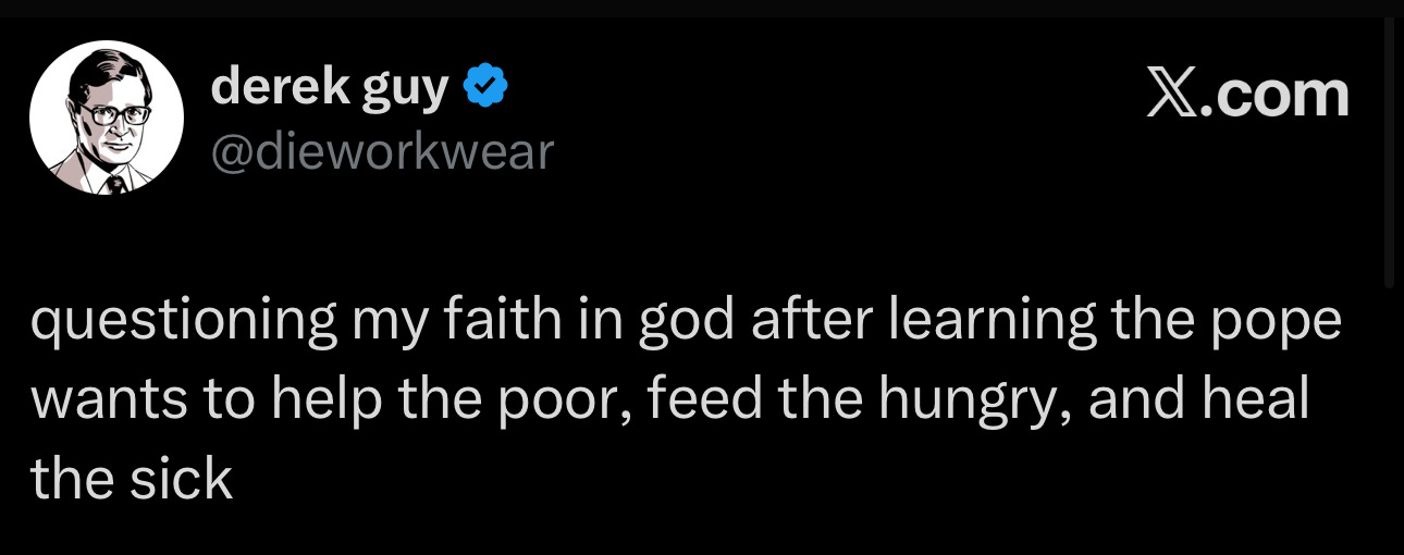 Writer Derek Guy sarcastically observed that he was “questioning my faith in God after learning the Pope wants to help the poor, feed the hungry, and heal the sick.”
