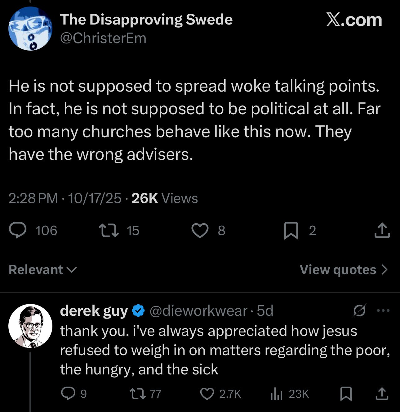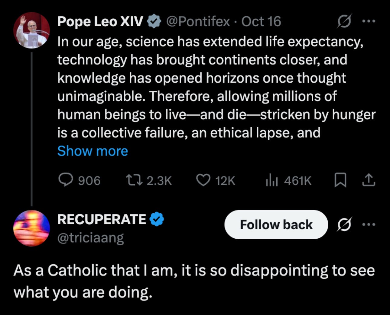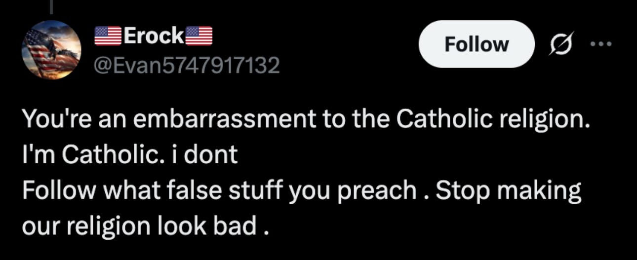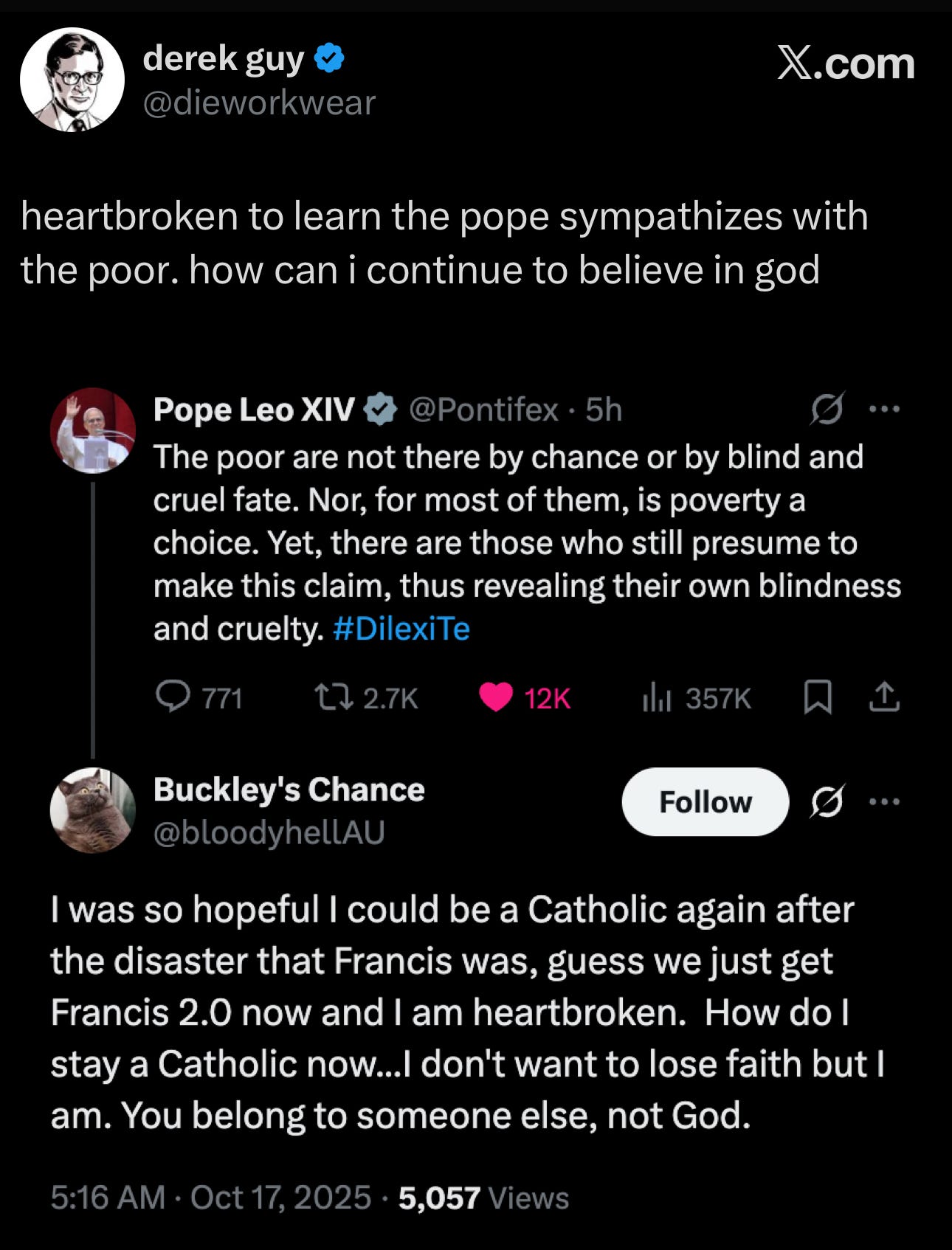 Nonetheless, MAGA Twitter (pardon, “X”) reactions ranged from outrage to despair. Leo’s post about poverty not being a personal choice garnered roughly 2,600 angry replies within hours. Some users even claimed they were now done with Catholicism over this boilerplate pope stuff.