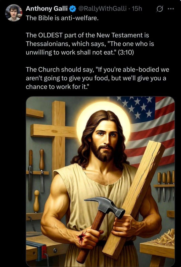 Another bizarrely insisted “the Bible is anti-welfare,” misquoting St. Paul’s dictum that “he who won’t work shall not eat” as if Jesus never preached mercy.