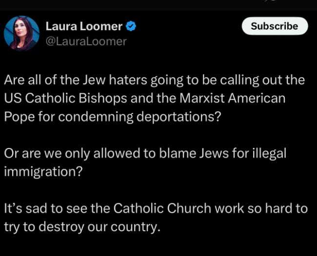 “Are all of the Jew haters going to be calling out the US Catholic Bishops and the Marxist American Pope for condemning deportations?” Loomer sneered.
