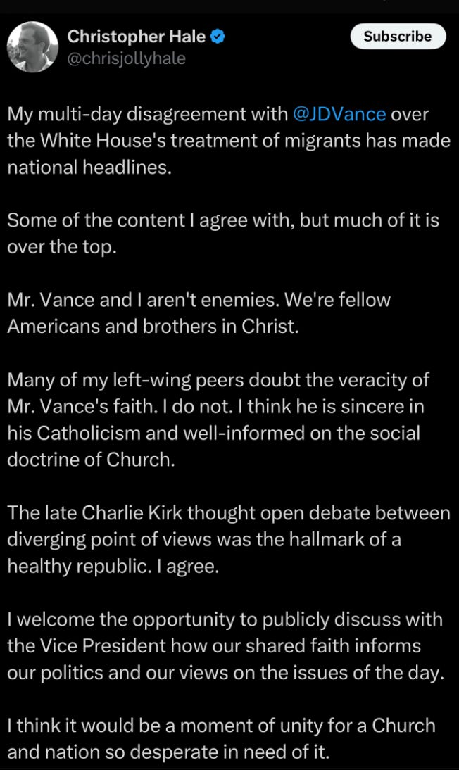 Rather than clap back or trade barbs, I chose a different path: I extended an open letter inviting Vice President Vance to join me in a public dialogue about how Catholics should approach the moral and political crises of our time.