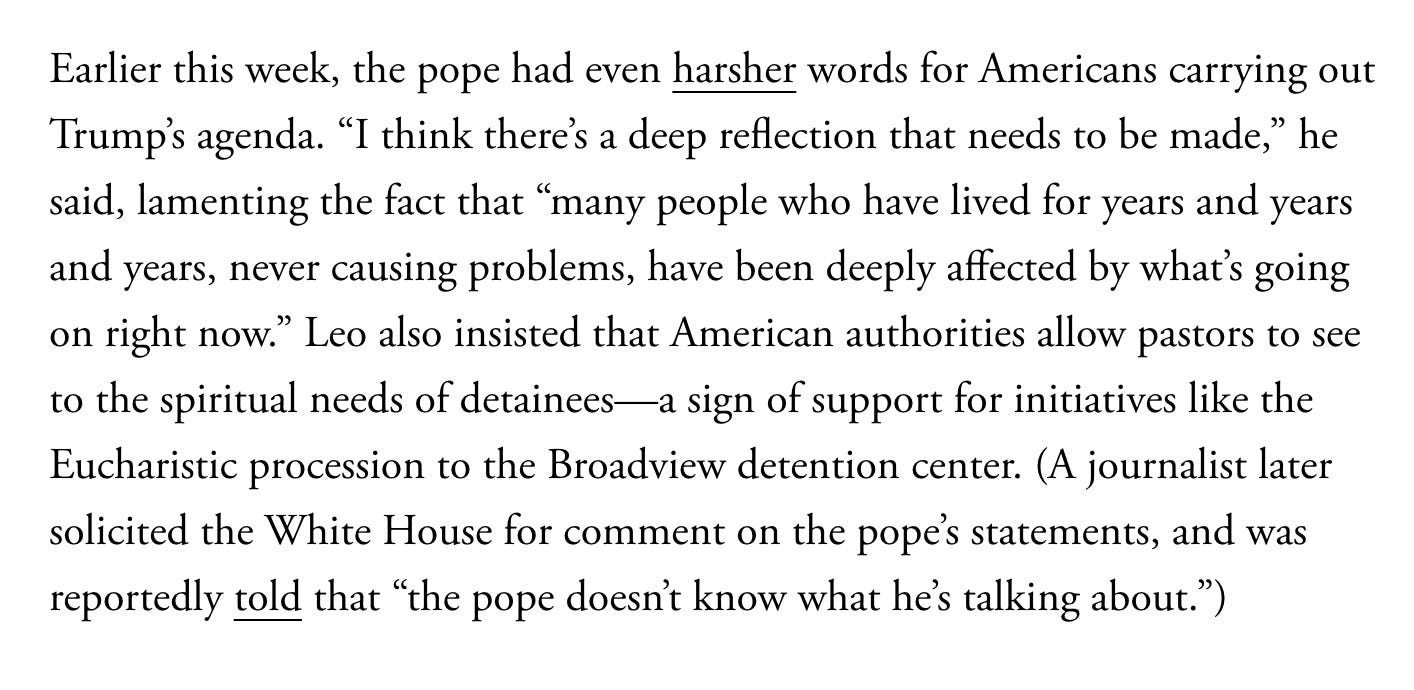In a Letters from Leo post earlier this week, I wrote about an unnamed White House spokesperson’s sneering dismissal of Pope Leo XIV’s latest migrant plea — “the pope doesn’t know what he’s talking about.”
