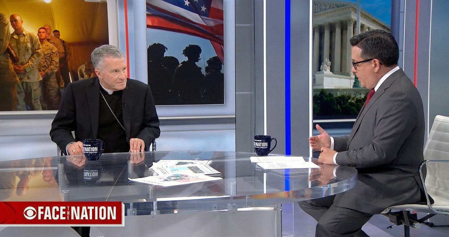 While Bishop Barron went on Ben Shapiro’s show to soften the pope’s anti-war message and reassure MAGA Catholics that the Holy Father’s words were merely “pastoral,” Broglio sat down with a CBS News anchor and stated flatly that this war does not meet the moral criteria that Catholic teaching requires.