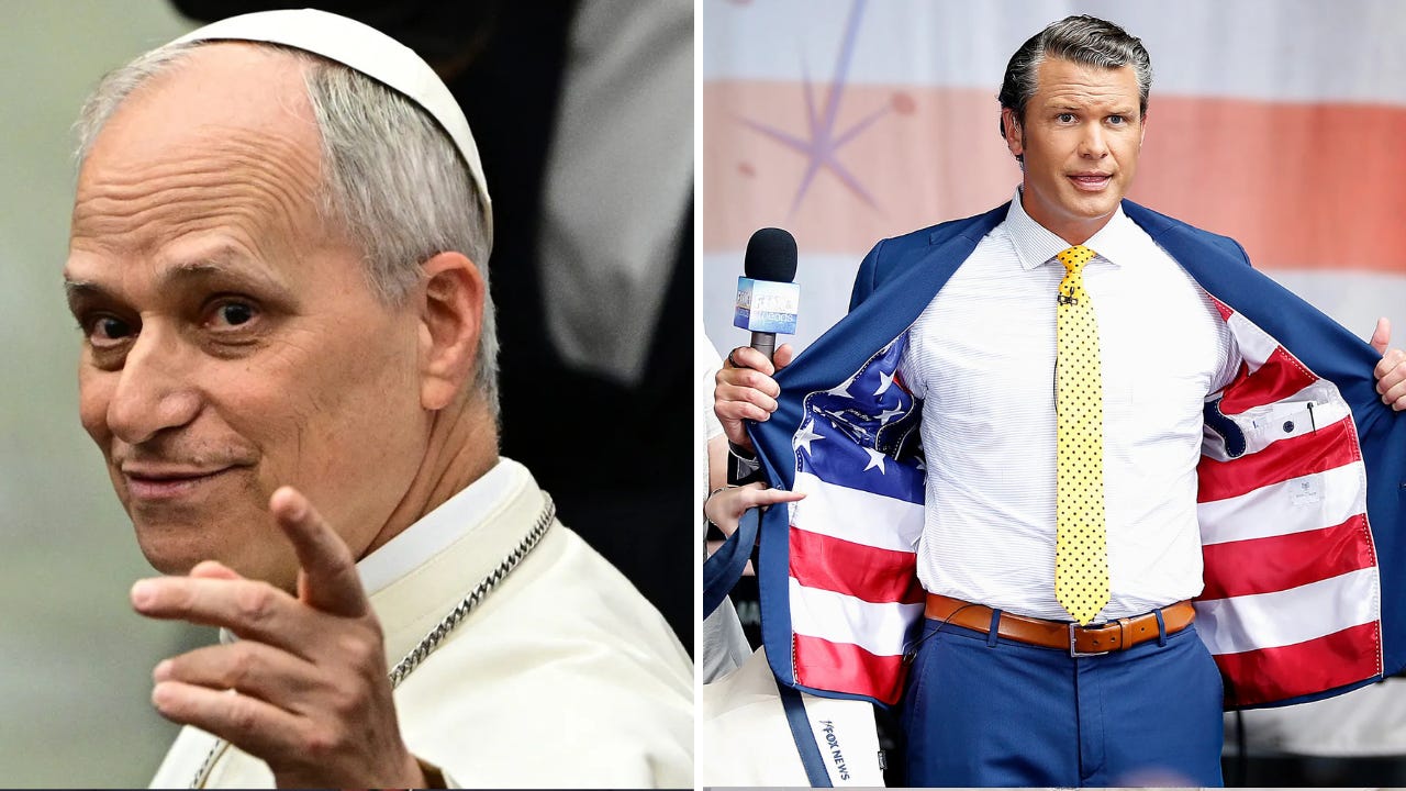 Former Fox weekend host–turned Trump defense chief draws fire from the first American pope.