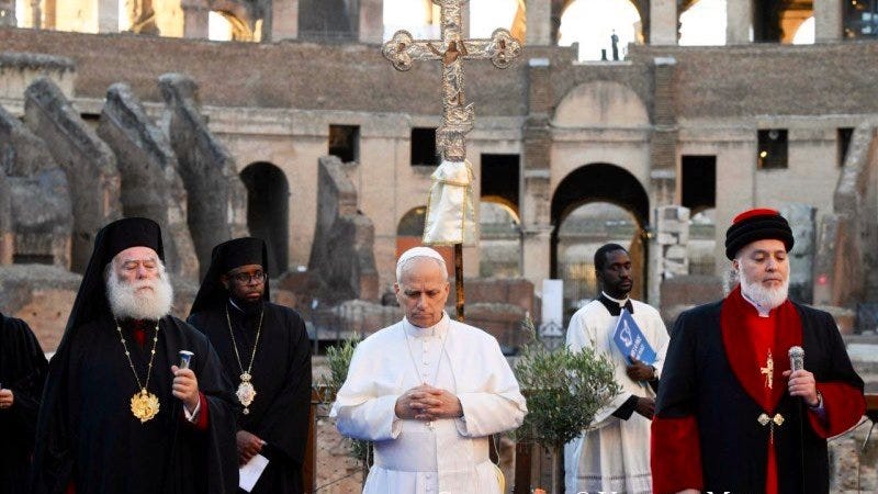 On a crisp evening outside the Colosseum, Pope Leo XIV joined dozens of faith leaders to plead for peace in our conflict-scarred world.