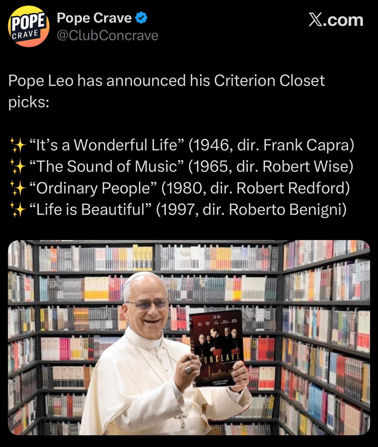 As for a fifth film, our friends at Pope Crave joked that Leo’s guilty pleasure might be the Vatican thriller The Conclave.