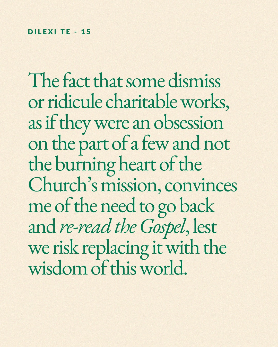 “The fact that some dismiss or ridicule charitable works, as if they were an obsession on the part of a few and not the burning heart of the Church's mission, convinces me of the need to go back and re-read the Gospel, lest we risk replacing it with the