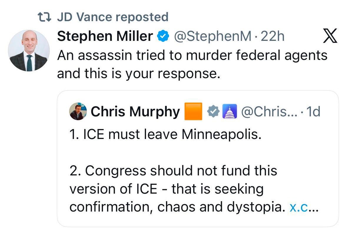 Noem’s DHS issued a press statement suggesting Pretti was an armed agitator who wanted to “massacre” federal agents. Miller eagerly amplified this line. He fired off a tweet calling Pretti “an assassin,” and Vice President JD Vance promptly reposted Miller’s smear to his own followers.