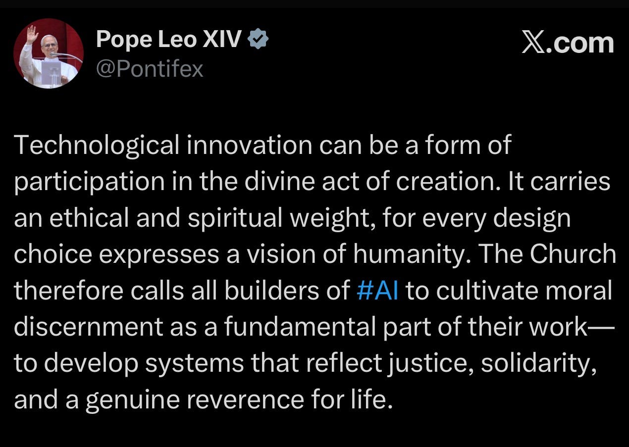 The pope had framed technological innovation as “participation in the divine act of creation,” carrying real ethical weight.