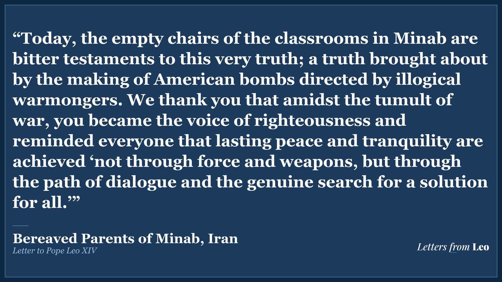 At Letters from Leo, we stand with the parents of Minab — and with the millions of Catholics and people of goodwill around the world who refuse to accept that a bombed elementary school, its floor covered in children’s notebooks, can ever be reconciled with the Gospel.