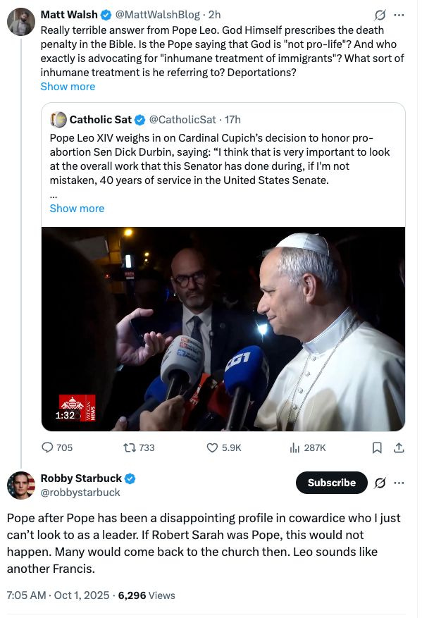 Prominent MAGA Catholic figures (from podcasters Matt Walsh and Taylor Marshall to Trump film‐maker Robby Starbuck) took to social media to condemn the pope’s words.