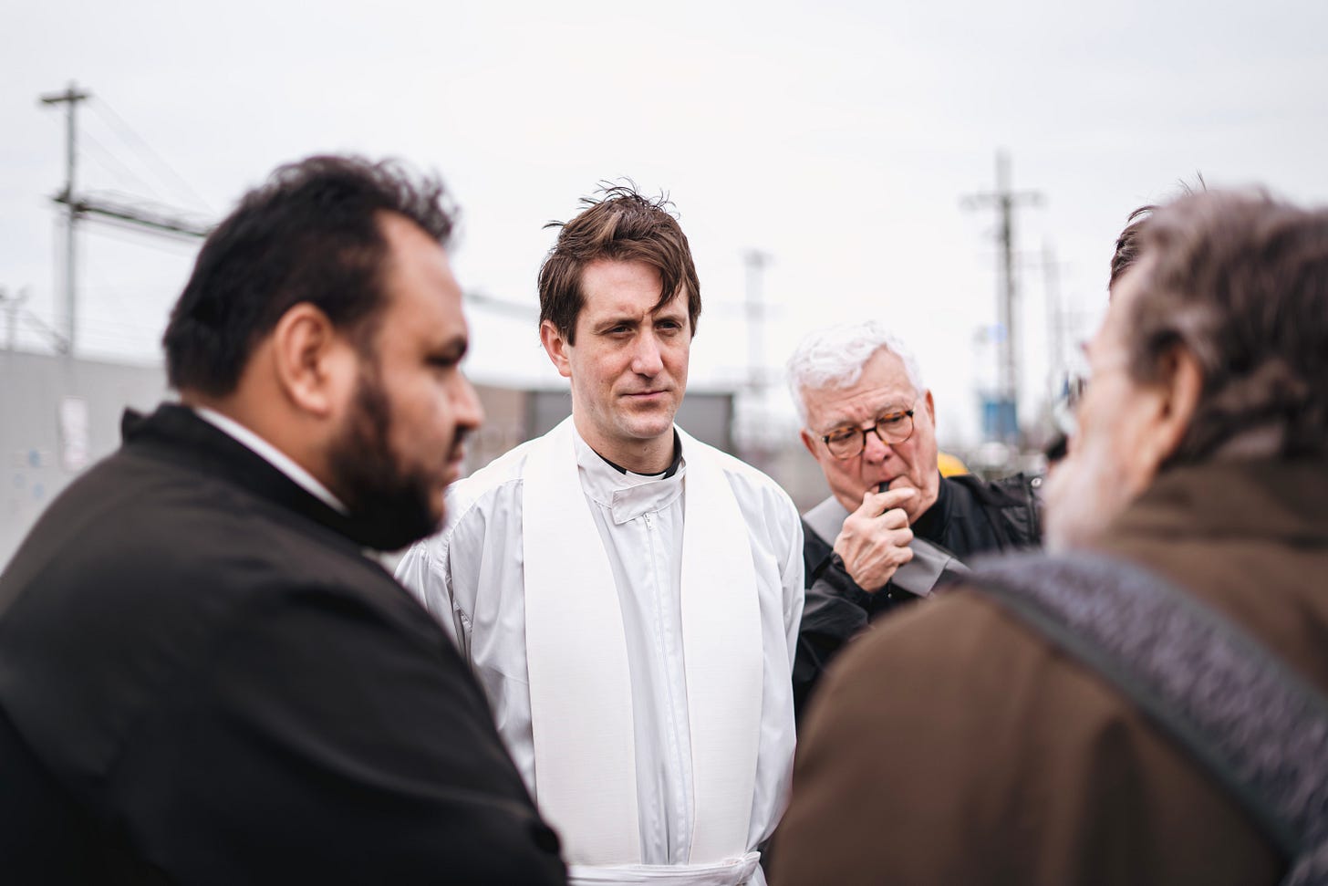 Sister Alicia Gutierrez, SH, distributed Communion. Father David Inczauskis, SJ, and Father Paul Joseph Keller, CMF, offered pastoral care to thirteen other detained migrants wearing handcuffs and ankle chains. Outside, fifty Catholic faithful stood in rain and heavy wind, praying the Rosary and singing, waiting for the pastoral delegation to emerge.