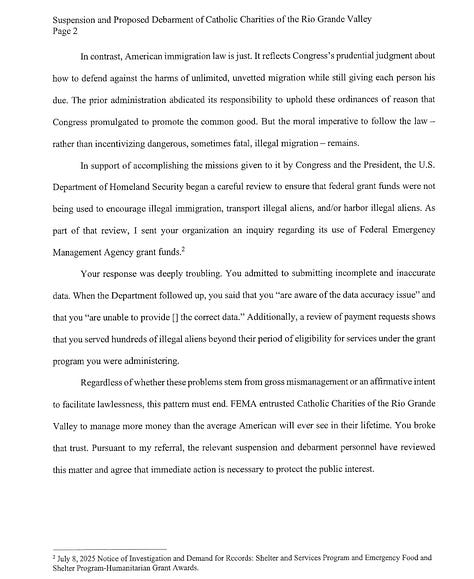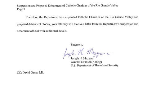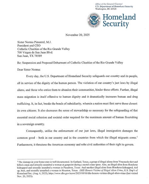 The Department of Homeland Security has suspended this Catholic charity from all federal funding and moved to debar it for six years — an unusually harsh penalty.