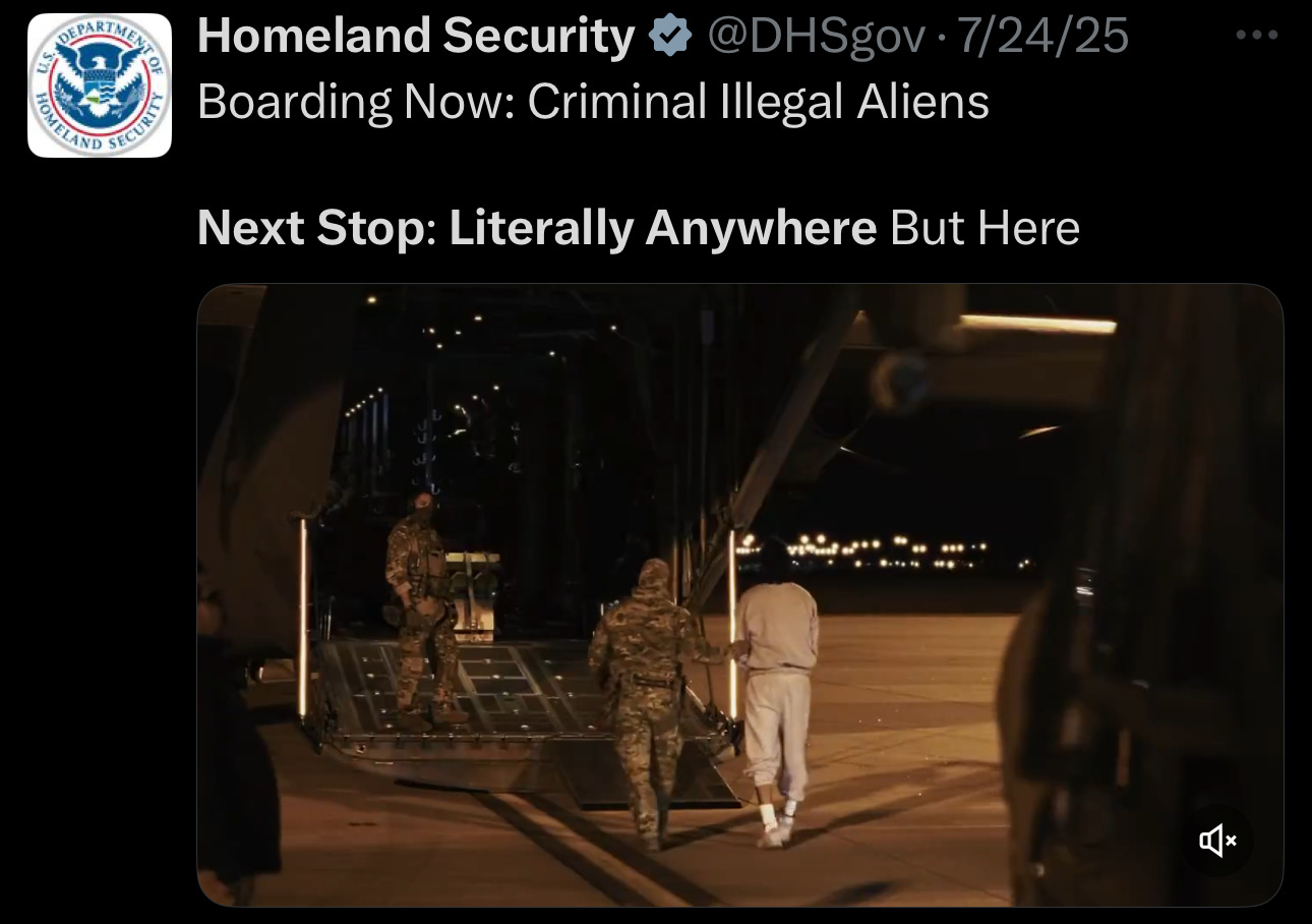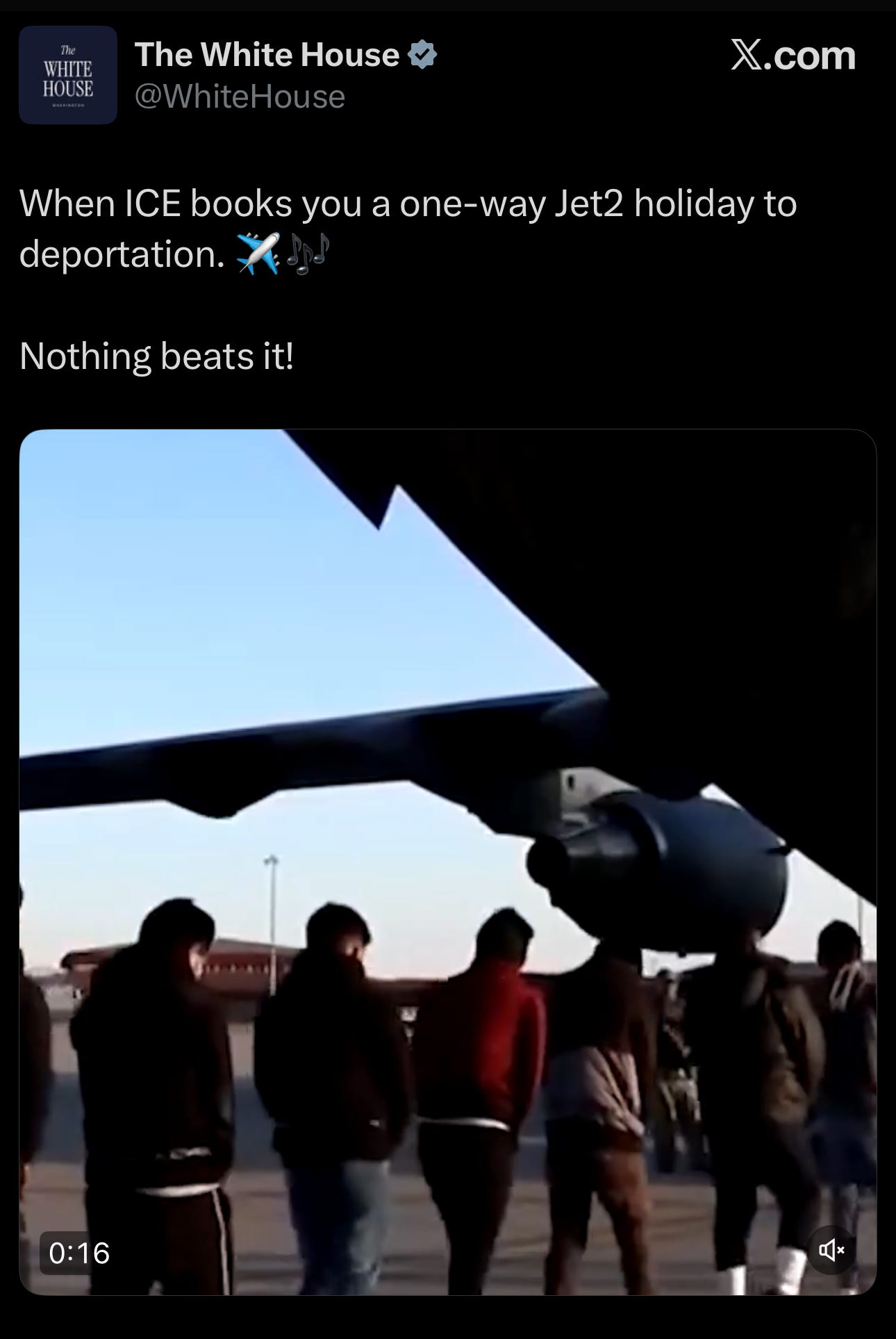 One Department of Homeland Security post paired footage of shackled detainees boarding a plane with a cheeky caption, “When ICE books you a one-way Jet2 holiday to deportation. Nothing beats it!” — set to a jaunty vacation jinglewired.com.