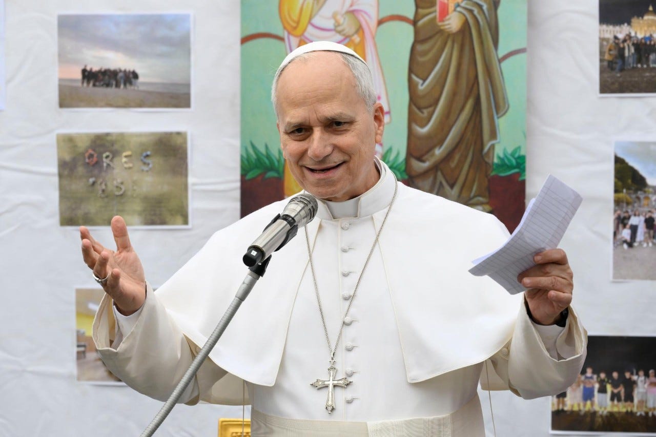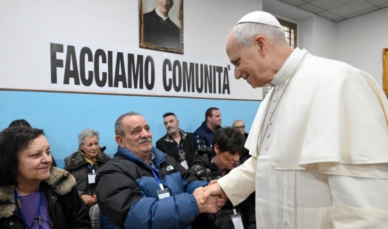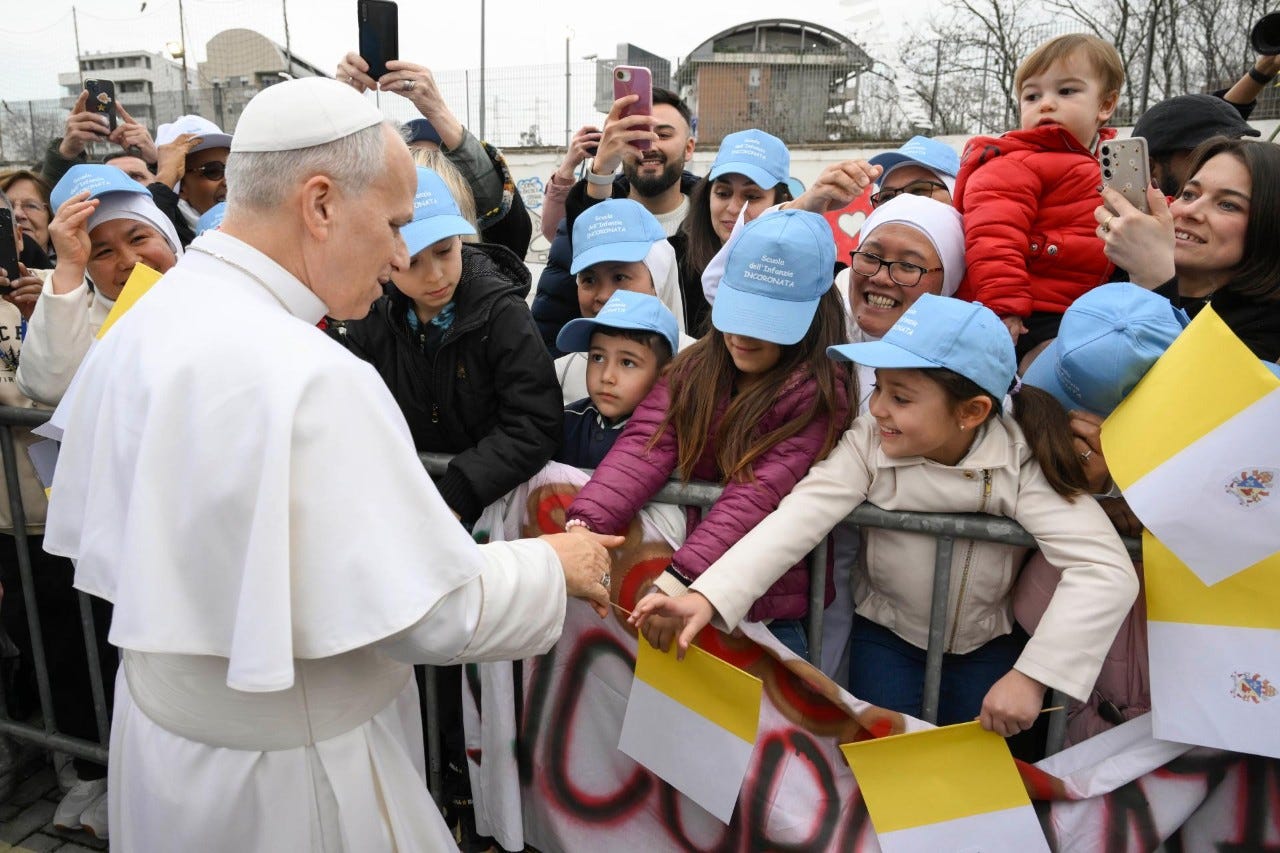 The pope met first with children on the parish sports field at the Church of the Ascension of Our Lord Jesus Christ, tended by the Dehonian Fathers — an order of priests who have stayed in the Quarticciolo when others left. The parish motto is “Let’s Build Community.” Leo told the children he was “very happy to be here with you this evening.”