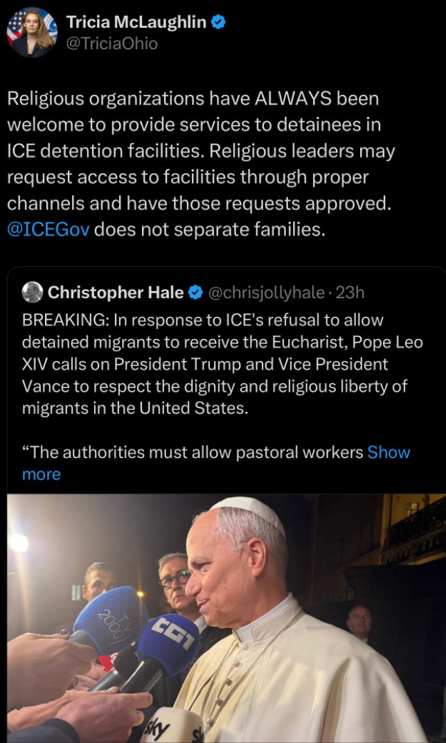 Tricia McLaughlin, the Department of Homeland Security’s assistant secretary for public affairs, took to X (Twitter) to accuse Pope Leo XIV of mischaracterizing the situation at ICE’s migrant facility outside Chicago.